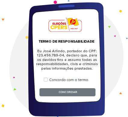 Digite no sistema o código que você recebeu via telefone (SMS). Após digitar seu código uma nova tela com os termos de aceite do processo eleitoral lhe será apresentada.